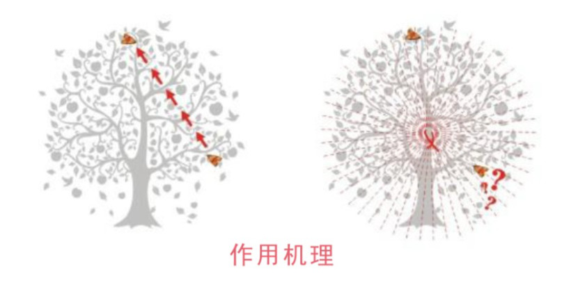昆蟲性信息素是雌成蟲分沁出的一種天然物質(zhì)這種物質(zhì)能夠散發(fā)氣味,雄蟲通過氣味尋找到雌蟲進行交配。利用該物質(zhì)研發(fā)的昆蟲性迷向絲產(chǎn)品[梨小食心蟲性迷向絲 澳福姆,蘋果蠹蛾性迷向絲 希艾姆],讓昆蟲雄蟲徹底迷失方向,使它無法準(zhǔn)確定位雌蟲,以阻斷成蟲交配,達到防治目的。