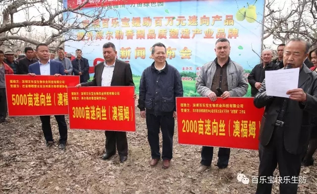 4月1日,深圳百樂寶生物農(nóng)業(yè)科技有限公司攜手庫爾勒市香梨研究中心、巴州庫爾勒香梨協(xié)會(huì)、托布力其鄉(xiāng)黨委鄉(xiāng)政府,在新疆巴州庫爾勒市下牙村舉行“深圳百樂寶援助百萬元迷向絲產(chǎn)品暨提升庫爾勒香梨品質(zhì),塑造產(chǎn)業(yè)品牌”新聞發(fā)布會(huì)。深圳百樂寶生物農(nóng)業(yè)科技有限公司董事長(zhǎng)蘇敏及副總裁馮金波、庫爾勒市托布里其鄉(xiāng)黨委書記胡文龍、庫爾勒市托布里其鄉(xiāng)長(zhǎng)艾合買提及副鄉(xiāng)長(zhǎng)依明、巴州庫爾勒香梨協(xié)會(huì)副會(huì)長(zhǎng)賈宏、庫爾勒市香梨研究中心主任李世強(qiáng)及副主任艾合買提·阿不都、農(nóng)二師各團(tuán)的職工代表及庫爾勒市的廣大香梨種植戶等參加了現(xiàn)場(chǎng)會(huì)議。