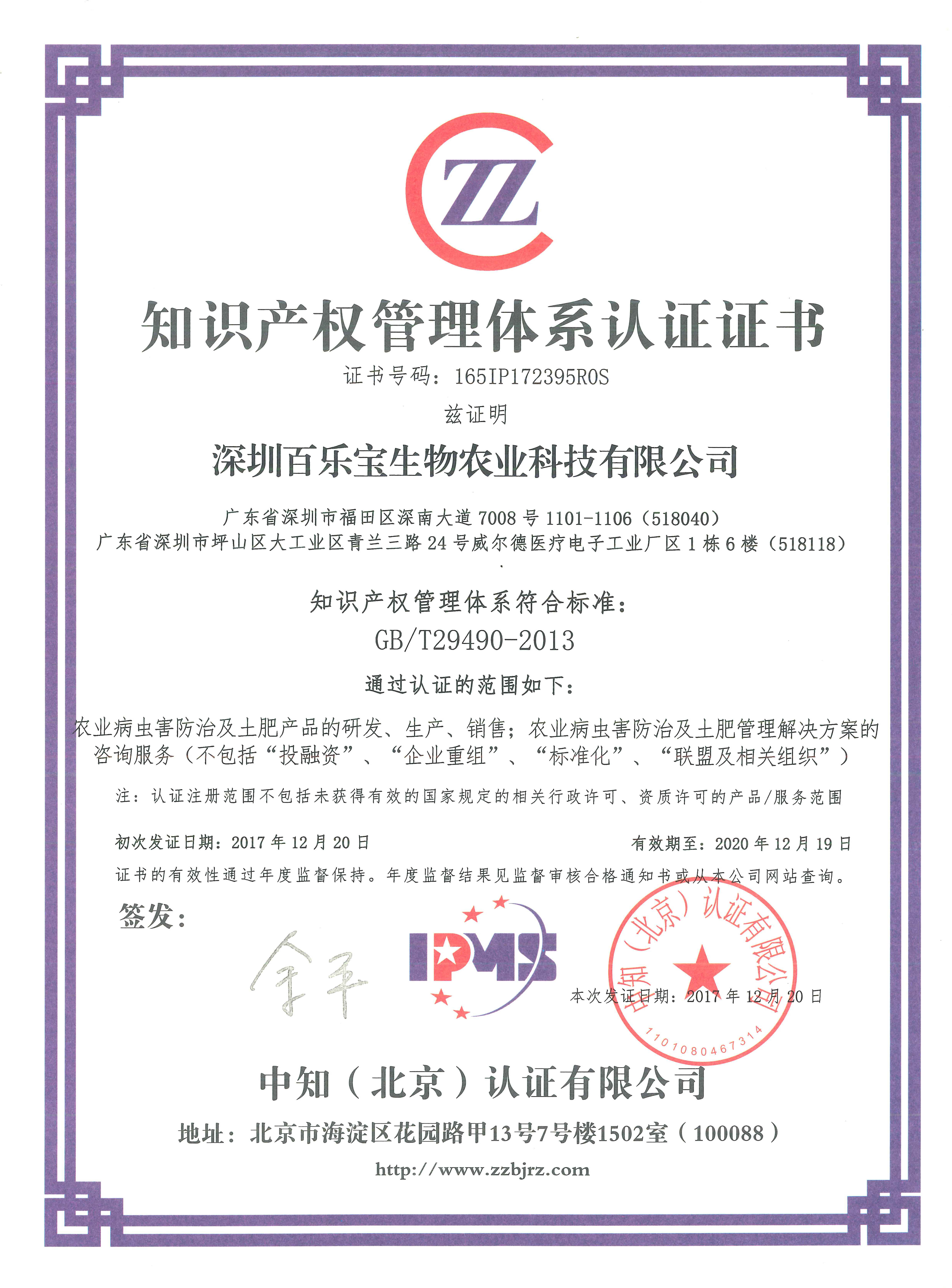 百樂寶順利完成了審核任務,并按照專家的要求進行了相應的改善,最終在農業(yè)病蟲害防治及土肥產品的研發(fā)、生產、銷售;農業(yè)病蟲害防治及土肥管理解決方案的咨詢服務方面得到權威認證,于近日獲得《知識產權管理體系認證證書》(證書編號:165IP172395ROS)。